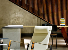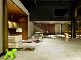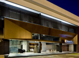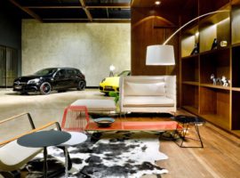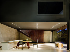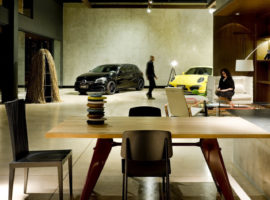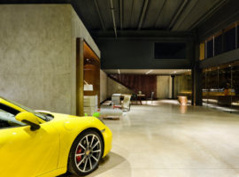 The Showroom Eurobike – Porsche, in Brazil, designed by 1:1 arquitetura: design reflects the brand and its high standards in an elegantly styled store front display lounge. It is about giving that visual appeal that attracts clients to take a tour of the various Porsche cars kept on display at the lounge by using steel corten, exposed concrete, glass and wood. The lounge is designed as an extension of the Porsche brand, where simplicity in design details is expressed vividly through the use of various materials. It is about racy, dazzling cars, which steal all the attention while the internal walls, flooring and admin office are underplayed, but emote strong connections to the store front.