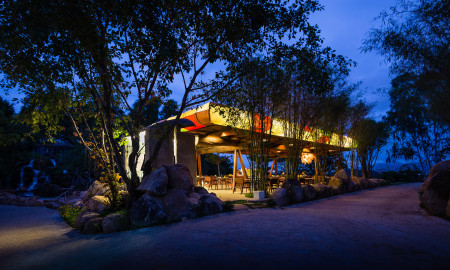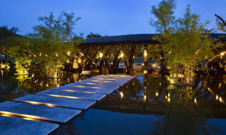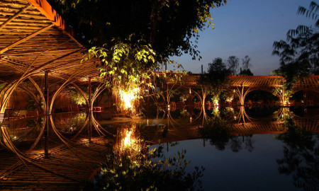 The Design of WNW Cafe, by Vo Trong Nghia, with 5000 bamboo poles tied together by rattan gives shapes to a hemisphere...