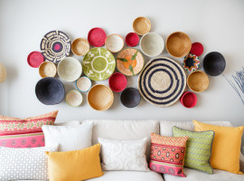 A bunch of colorful baskets: When money is a constraint and you don’t want to make any sort of long-term change, the best solution is to get a bunch of colorful baskets or trays. This will not only give you the option to get more vibrant with the otherwise dull wall, but you can also do a lot of basket painting on your own to create a series or pattern.