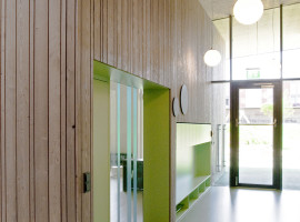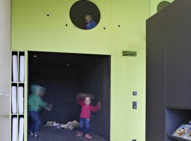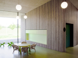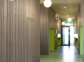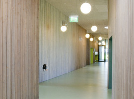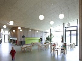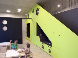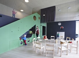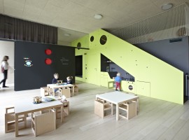 Amazingly enough, each pair of classrooms forms a single connected unit, which also provides room for rest and movement. In addition, each classroom boasts of an anteroom, cuddling corner, toilets, a gallery, and a storeroom. Largely, the interior design focuses on communication and experience, realised through the generously spaced and brilliantly designed interiors.