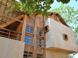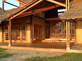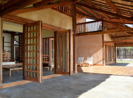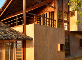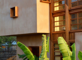 Each of the four volumes remains individually built connected by means of internal corridors and staircase sheltered by the diagonally opposite thatched roofs. The two volumes on the front are single tiered while the rear two blocks are double tiered, which make the inclination of the roof possible with varied opening flaps. Conversely, the upper level of the rear volume remains offset externally to the lower volume, thus creating a natural sun-shading device to the home.
