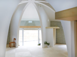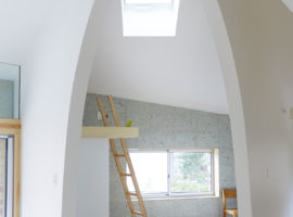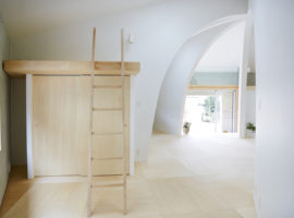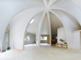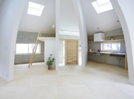 Designed by Hiroyuki Shinozaki Architects, the House I, in Tochigi, Japan, stems internally from a radial pattern of the ceiling that comes down as a wall to support the sub-structural members of the house. The facade of the house is more than just a boxed enclosure and has a lot of activity going on in the internal spaces. At the onset, the home was designed for a family of 3 where each defined space had a specific activity and their extents were set by the walls that radiated to converge at the roof.