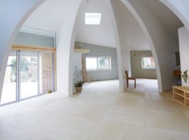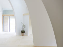The palette of colours chosen for the home is of light beige and pale white hues, which accentuate the lighting aspects inside the house. There is minimal detailing of work, to highlight the seamless effect of the radiating walls to the ceiling, which has textured white paint to bounce of the light. Low seats, cedar furniture, and green potted plants enliven the interior decor that creates a harmonious line for the inmates to feel comfortable at home. Each view from the house gives away glimpses of the surrounding nature and its terrains. The House I is a warm and cosy place to stay, away from the urban concrete and glass facades.