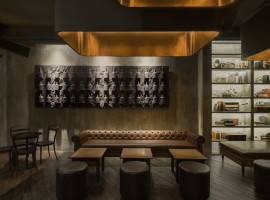 Even the bespoke furniture fits rights into the picture as it exudes the same feel, and the space is evocative of a private retreat with a drop-down ceiling and copper tarnished lights.