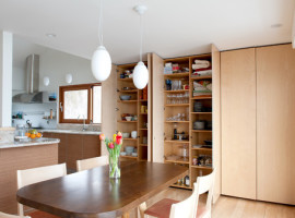 If your house is based on an open layout, then it may seem like a bad idea to transform an entire wall into storage space. However, it can be a good option considering the limited amount of storage that a buffet has to offer. In this home, the homeowners took up an entire wall, which has been converted into a complete storage solution that can hold linen, dishes, pantry goods, etc in a seamless way.