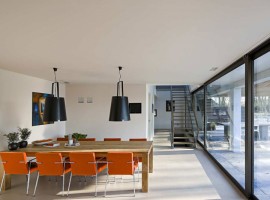 Furniture and lighting: While not much is known about the furniture choices, the dining areas has contrasting and accenting orange set that matches nothing but the color of the paintings. For the needs of lighting, the lighting designs and choices are in a variety, starting from LED lights on the ceiling to the large pendant lights used as needed, which brings in style and statement.