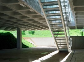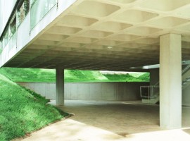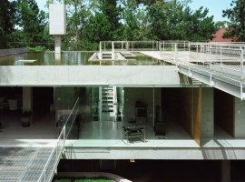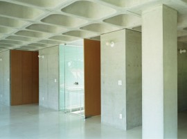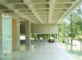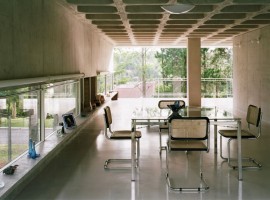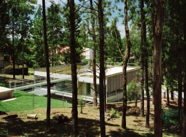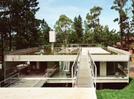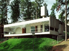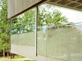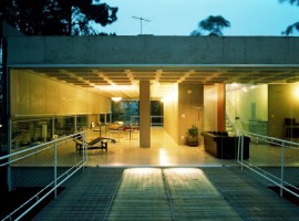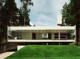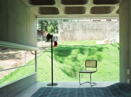 The exteriors: The house is made mostly in a blend of glass and concrete to tap on the location. By using concrete pillars, the house has been lifted off the ground and the area under has been created. The concrete structure of the house comes in glass that is used without any frames. The external areas and floors have been designed in concrete sanded style, while the walls on the outer area have been shaded with panels crafted of cement and industrial wood. The roof has a water surface that acts for its protection.