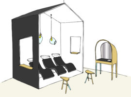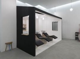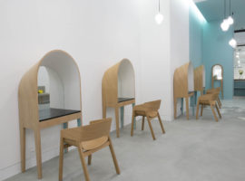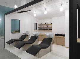 These hooded units are elegant to look at and increase the intimacy of the client, in the open layout of the salon. Also, a cabana is designed at the back with a black exterior and white interior, which acts as a hair wash area. It has a lounge deck seat, which reminds one of being near the sea whilst having their hair washed and groomed. Even the lights are custom designed and appear to be hanging in the shape of a hair dryer that completes the look of the salon. On the whole, it is a classic styled salon, subtle and fresh with design elements native to the region.