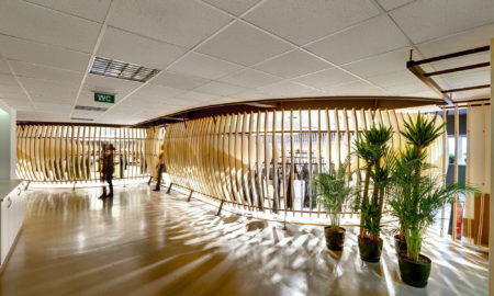 WakuWaku, a bistro designed by Ippolito Fleitz Group in Germany, is an industrial themed décor, with wood as the primary construction material.