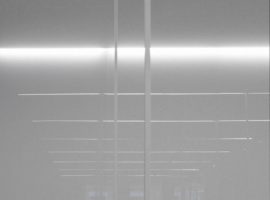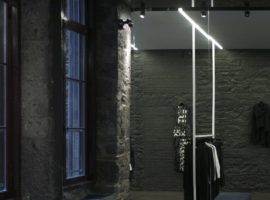 A black and white wall with suspended display cables creates a tension between the space for the clothing and that resonates well with the gradient lighting pattern on the ceilings from dark to light. The transition from the dark entrance herringbone steel plates to the hardwood floor, which moves from darkness to reflective bright lights, the space is kept in a state of motion, which keeps the ambience lively and energetic. Rooms that ought to be hidden from view are the fit out areas, the back office and kitchenette, which are all creatively designed behind the wall length display racks and are steered away the from public sight.
