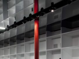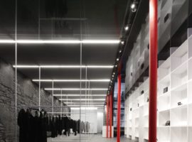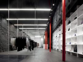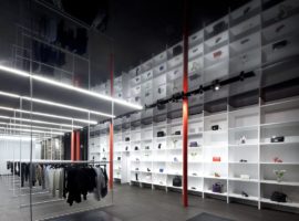 The walk through between the suspended cables and the display rack with odd cubical shelves is for the consumers to explore, see and feel the space, which alternates between the displayed goods, lights and materials. A very rustic and retro effect is shed on the walls, which complements the interior décor of the retail store by leaving the walls to a black charred state. It enhances the feel of the store and is quite a refreshing take on modern retail outlets to follow in the coming years.