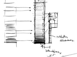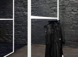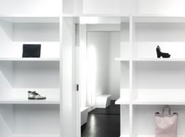 The Cahier d’Exercices designed by Saucier + Perrotte Architectes in Montreal, Canada is a fashion retail outlet for clothing, accessories, shoes and leather goods. It is a narrow strip of layout, worked out with a black and white combination, which brings out the luminosity of the space, the displayed goods and the brilliant use of materials in a gradient pattern. The use of black hardwood for the floor, ceilings, complements the charred black brick wall that runs over the entire stretch of the store. On one side, the exposed wall and the other side, the open cubicle shelves in white create a perfect ambience and display arena for the merchandised goods.
