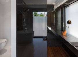Besides the common area, the interior design includes the kid’s rooms and a master bedroom. These rooms are located sequentially and distinguished by a merger of painted concrete and Ipe wood decorations, whereas the private bathtub is made of porcelain, overlooking the barbeque area.
