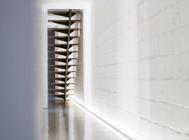 A quintessential modern day building with recomposed facade, full-height steel door, and large windows; it exhibits a safe and eminent design all through the stretch. Moreover, walking down the single stringer staircase, a wide corridor extends along the north-south axis and opens into a linear progression of rooms with tinted glass partitions.