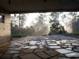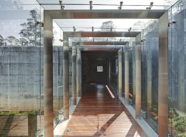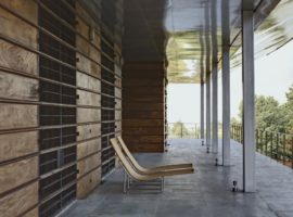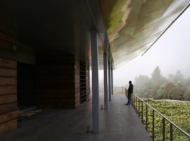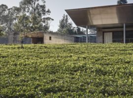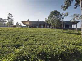 The House in a Tea Garden by RMA Architects is located in Connoor, a hillside region in the southern part of the Indian sub-continent. It is a house that is surrounded by tea plantation and was designed to be more like a guest house for tea plantation fraternity members. A very unique design idea which uses an inverted steel canopy cantilevered from one end and extends to shelter the verandah facing the tea garden. It is a house that is highly known for its concrete and stone slab casts, which are, in turn, enhanced by the use of rich wood textures for the individual cabins facing the frontal tea garden.