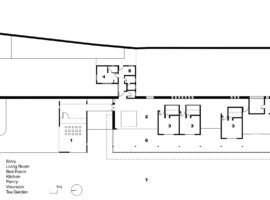 A one level and open layout floor plan, the house consists of a wide entrance lounge, through which one enters into a vestibule, which opens onto a living lounge. The living area is designed with a sunken seat built from concrete situ and is padded with leather for better comfort and elegance. From the living area, the entire space extends out as a verandah and expands towards the sides to hold 3 individual wooden cabins. These wooden cabins are used as guest bedrooms, which face the tea gardens and have a better viewing point through the verandah.