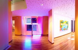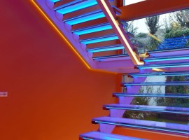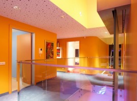 The interiors: The interiors of the house have been designed with double layers. For example, all the shafts, doors, pipes, wardrobes have been designed inside the surfaces of the layers. More than anything else, the rooms here glow by the night, bringing a rare design together that is easy to love and extremely fun to lounge around. Although orange is the main theme, there are other colors including blue and pink that are visible throughout the house. Apart from the colors, there are many paintings, mostly colorful ones, which are used all around the main living areas.