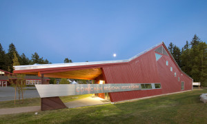 The Cowichan Regional Visitor Centre, by Cohlmeyer Architecture, renders a distinct image of a modernistic building, with pitched rooflines in a contemporary...
