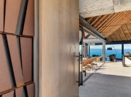 Overall, the residence is L-Shaped and has open spaces built in-between enclosed rooms that lend a relaxing and harmonious exterior, with chaises and outdoor seating. Each of these distinct spaces inside the residence has an individual character reflecting various materials such as that of the corten steel, the timber panels, the grass roof, and others sourced from the local region.