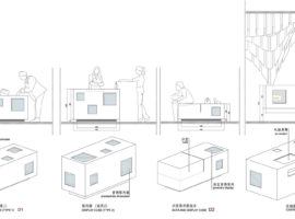 Additionally, a rectilinear volume of steel frames turns out to be a stunning piece of customised furniture, with varied functional adaptability. Moreover, this rectilinear prototype generates different kinds of furniture units, such as display cabinets, billing desk and lounger for seating purposes. These units, wrapped with grey felt material, are the only furniture found in a retail store.