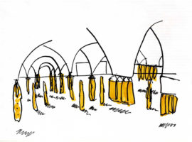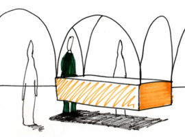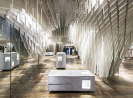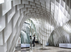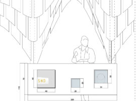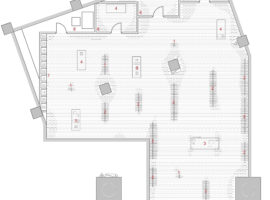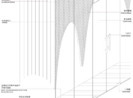 To realise this concept, software simulated a ceiling, based on the physical properties of an elastic material, wherein the weight of the suspended objects pulls down the ceiling, to produce an abstract visual. With this simulation in mind, the use of a permeable membrane such as fibreglass enhances the planning and installation of technical elements related to lighting, air conditioning units, acoustics, and fire alarm systems.