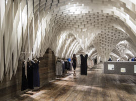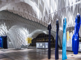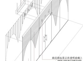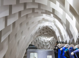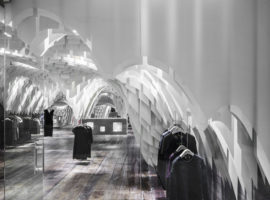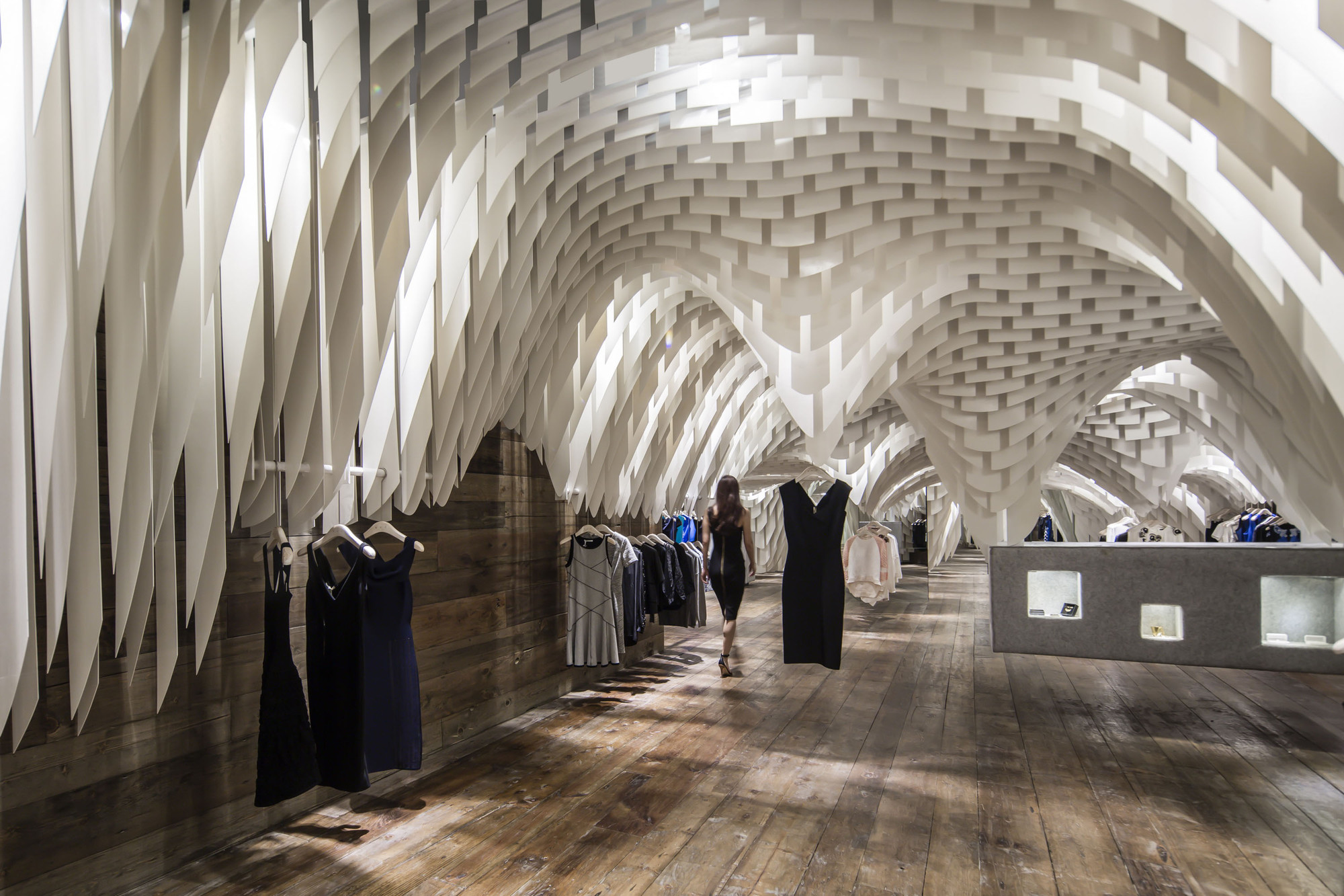 Altogether, the ceiling embraces the avant-garde nature of the clothing line and gives life to an abstract form that hovers over the retail store.