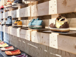 On the other hand, the plaster blobs come alive with a fresh coat of paint, to render a warm texture to the store whilst the pallets and tyres stay hung on either sides of the wall to display the spectacular collection of recycled shoes on board. The other interesting feature of the store is the use of a “U-Shaped” Iron section, which holds the signature collection of recycled shoes, which captures the attention of the passer-by on the street. Above all, everything about this store is innovative, with precision in detail, which bowls over imagination with its vivid colours, choice of materials and creativity towards an attainable vision.