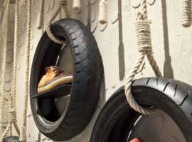 Furthermore, the interior décor of the store is equally unique and resonates with the concept by the use of recycled materials such as sturdy ropes made from long twisted threads, tied to vertically aligned rubber tyres on one end and wooden pallets on the other end of the wall. These additions, of recycled elements, lend a touch of industrial finesse to the décor, to complement the brand identity of the recycled products on display.