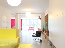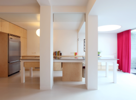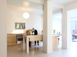 The Dwelling Refurbishment in Eindhoven, Netherlands by De Bever Architecten is a refurbished home, originally depicting a classic old villa with a 30s styled interior decorating ideas. It is a home to a young couple with their two children, where internal walls divide the major spatial activities in the ground floor of the villa. An open layout is adopted, which brings about a clean look that connects the floor visually with the existing elements, minus the demolished walls. At the entrance, the wall is retained to contain the existing bathroom and cloak stand, which is hidden from view.