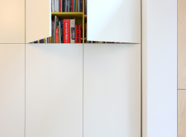 On the inside, the house is elongated towards the rear end with concrete floors and is given a full view through an aluminium sliding door and a skylight that illuminates the portions near the kitchen. As the layout is open, there is ample space for living, dining and cooking, where the family can spend time together with their children. Other aspects of the design are the customised furniture pieces for the kitchen counter, a white leather couch near the dining and the yellow leather couch cum cabinet for the living that speak of some incredible decoration ideas. All of these casework details are multipurpose in use and keep the house from unwanted clutter. There is also a neatly designed wall hung cabinet that is covered with pine wood, and has open cubical shelves for storage at its sides and closed cabinets at the front.