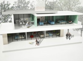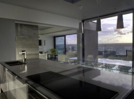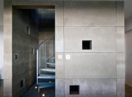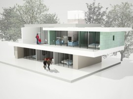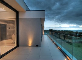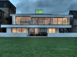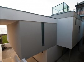 The architecture of the house sets it below the road level by 7 meters, while the roof works as the parking for three cars. The main highlight is the brightened glass cube for the entrance that gives the home its name. The glass glows by the night to show green when the weather is good, and when the atmospheric pressure falls, it gets red to inform and warn the yachtsmen of storm and weather conditions. The core of the house is in concrete, and the roof and floor decks seem to be hung from there.