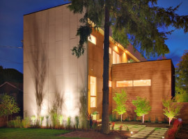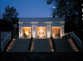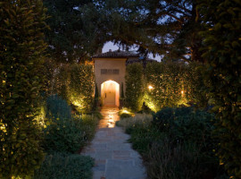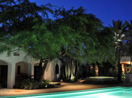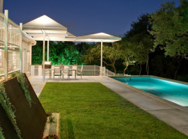 Here are some lighting options at night, lit both inside and outside in different degrees of brightness. From gleaming fountains to delicate patio lights, shining trees to dimly lit pools, there are a lot of options to add a little glow to your home at night.